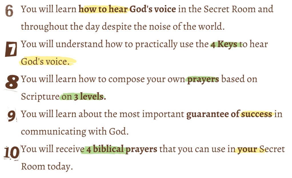 The course includes a section on “The Practice of the Secret Room,” where you will learn about the role of the Holy Spirit, the importance of the Bible, and fasting, as well as the author’s personal experience with using a calendar, reminders, and “checking the clocks,” which makes it very practical.