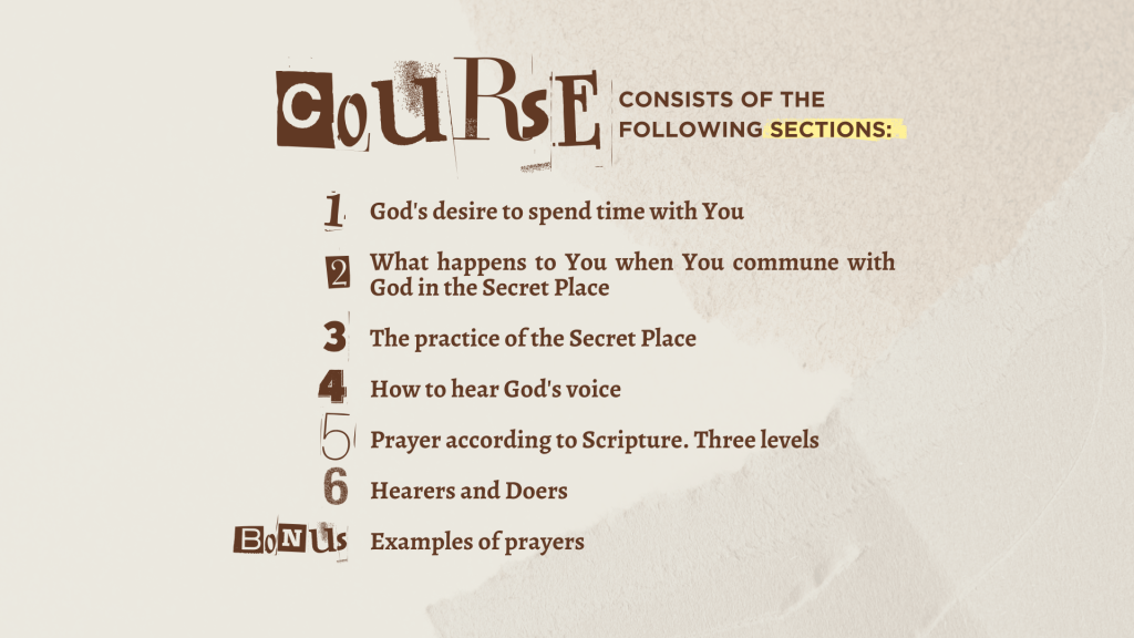 The course is not limited to prayer. It covers a wide range of aspects of a relationship with God, including His desire to spend time with you, the impact of communicating with Him on your life, the importance of the Holy Spirit and the Bible, fasting, and practical tools for deepening this relationship.